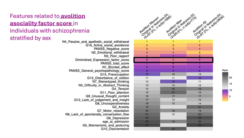 Analysis: Positive symptoms scores were removed as literature suggested the outcomes were more related to negative symptoms. Dataset was stratified by sex and also compared to analysis using all subjects